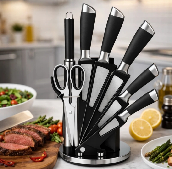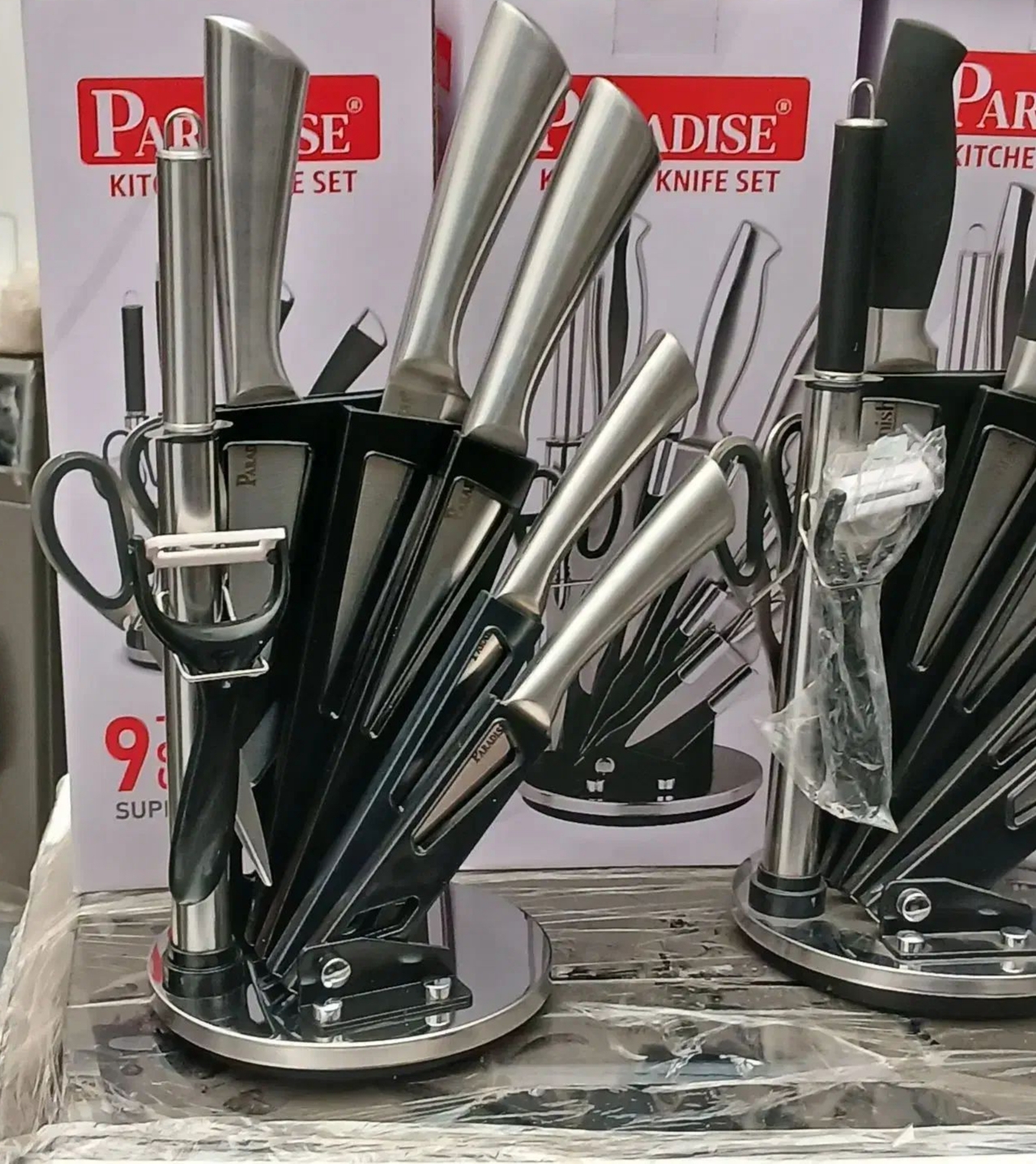 سرویس ۹ پارچه کارد و ساطور شامل مجموعهای کامل از کارد و ساطور در سایزهای مختلف، مناسب مصارف خانگی و آشپزخانه. تیغهها با کیفیت برش مناسب، دسته خوشدست و طراحی زیبا. همراه با پایه نگهدارنده، نظمدهنده و دسترسی آسان. انتخابی کاربردی با قیمت اقتصادی برای استفاده روزمره. این سرویس دارای یک پایه چرخان به همراه ۴ عدد چاقو در ۴ سایز مختلف، ساطور قطور، پوست کن، چاقو تیز کن و قیچی نیز می باشد.
